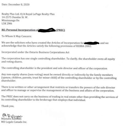 A legal letter prepared and signed by an Ontario solicitor or corporate lawyer that re-confirms the corporation's article and by-laws are prepared as per PREC regulations.